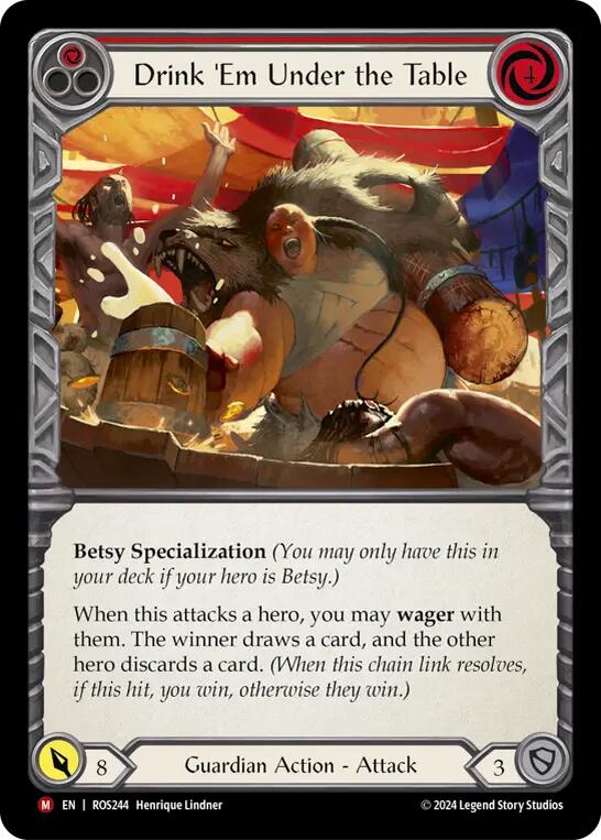 When this attacks a hero, you may wager with them. The winner draws a card, and the other hero discards a card. (When this chain link resolves, if this hit, you win, otherwise they win.)