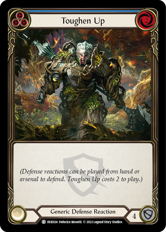 (Defense reactions can be played from hand or arsenal to defend. Toughen Up costs 2 to play.)